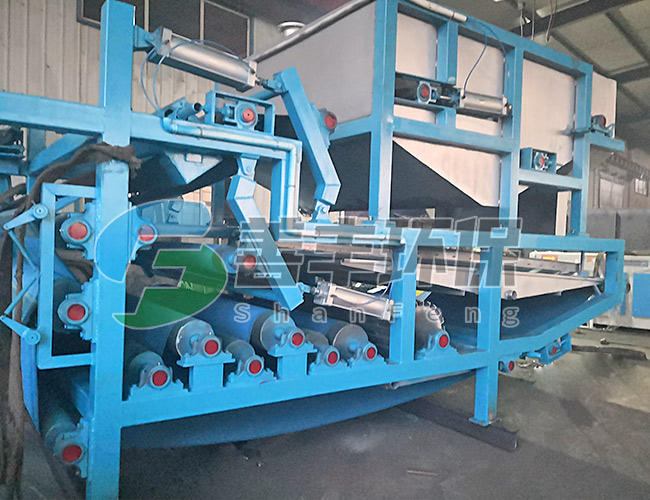 污泥經(jīng)投加凝聚劑后進(jìn)行充分混合反應(yīng)之后流入濃縮段的進(jìn)料分配器,將污泥均勻分布到傾斜式的濃縮段上,并在泥耙的雙向?qū)韬椭亓ψ饔孟?,污泥隨著濾帶的轉(zhuǎn)動(dòng),迅速脫去污泥的游離水。重力脫水后濃縮污泥經(jīng)反轉(zhuǎn)機(jī)構(gòu)將污泥輸送至帶式壓濾機(jī)的重力脫水段進(jìn)一步脫水。然后喂入“S”形壓榨段,在“S”形壓榨段中,污泥被夾在上,下兩層濾布中間,經(jīng)若干個(gè)不同口徑輥筒反復(fù)壓榨,使污泥再一次脫水,醉后通過刮將泥餅刮落,而上下網(wǎng)在運(yùn)行過程中不斷地被自動(dòng)清洗。