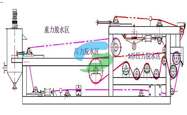 紙漿污泥經(jīng)輸送泵進(jìn)入動(dòng)(靜)態(tài)混合器,與同時(shí)加入的濃度為0.05~0.1%陰(陽(yáng))離子絮凝劑溶液相混合并充分反應(yīng)后,渣(泥)漿中的微小固體顆粒(或懸浮物)聚凝成體積較大的絮狀團(tuán)塊,物料間的結(jié)合水及表面水被分離成自由水,當(dāng)物料被輸送鋪展到加長(zhǎng)的重力預(yù)脫水區(qū)(或污泥脫水機(jī)上)的濾網(wǎng)上,在重力的作用下自由水透過(guò)濾網(wǎng)背面而滲出分離,形成不流動(dòng)狀態(tài)的污泥,達(dá)到壓榨脫水區(qū)實(shí)施壓力條件,然后隨著網(wǎng)帶的移動(dòng)而夾持在上下兩條網(wǎng)帶之間,經(jīng)過(guò)具有可調(diào)張緊力的過(guò)濾帶及直徑逐漸遞減的轉(zhuǎn)輥和對(duì)壓輥,實(shí)施連續(xù)增加的緩慢的對(duì)輥擠壓力、剪切力作用,通過(guò)楔形區(qū)、低壓區(qū)、中壓區(qū)、高壓區(qū)和對(duì)輥擠夾區(qū)將渣(泥)漿中的水份經(jīng)過(guò)逐級(jí)增壓的方式不斷擠壓出來(lái),然后形成含水率較低的濾餅排出,通過(guò)刮料板刮離,上下濾帶分開(kāi),經(jīng)過(guò)高壓沖洗水及滾刷清除濾網(wǎng)表面孔隙中的微量顆粒,繼續(xù)進(jìn)入下一步脫水循環(huán)。