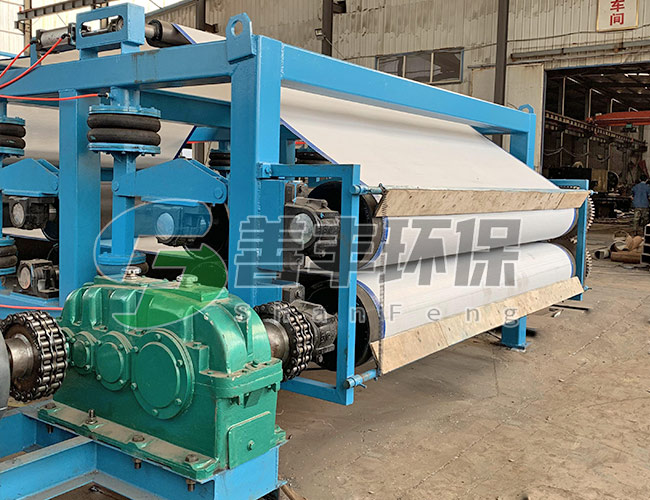 紙漿污泥經(jīng)輸送泵進入動(靜)態(tài)混合器,與同時加入的濃度為0.05~0.1%陰(陽)離子絮凝劑溶液相混合并充分反應(yīng)后,渣(泥)漿中的微小固體顆粒(或懸浮物)聚凝成體積較大的絮狀團塊,物料間的結(jié)合水及表面水被分離成自由水,當物料被輸送鋪展到加長的重力預(yù)脫水區(qū)(或污泥脫水機上)的濾網(wǎng)上,在重力的作用下自由水透過濾網(wǎng)背面而滲出分離,形成不流動狀態(tài)的污泥,達到壓榨脫水區(qū)實施壓力條件,然后隨著網(wǎng)帶的移動而夾持在上下兩條網(wǎng)帶之間,經(jīng)過具有可調(diào)張緊力的過濾帶及直徑逐漸遞減的轉(zhuǎn)輥和對壓輥,實施連續(xù)增加的緩慢的對輥擠壓力、剪切力作用,通過楔形區(qū)、低壓區(qū)、中壓區(qū)、高壓區(qū)和對輥擠夾區(qū)將渣(泥)漿中的水份經(jīng)過逐級增壓的方式不斷擠壓出來,然后形成含水率較低的濾餅排出,通過刮料板刮離,上下濾帶分開,經(jīng)過高壓沖洗水及滾刷清除濾網(wǎng)表面孔隙中的微量顆粒,繼續(xù)進入下一步脫水循環(huán)。