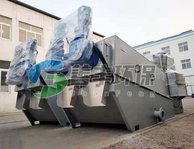 2、在主軸上,位于排泥箱內(nèi)設(shè)有阻泥板,阻泥板與脫水簡(jiǎn)之間留有間隙。阻泥板的設(shè)置可阻擋污泥,使脫水簡(jiǎn)內(nèi)的污泥具有一定的壓力, 可將污泥中的水充分?jǐn)D出,達(dá)到更好的脫水效果。