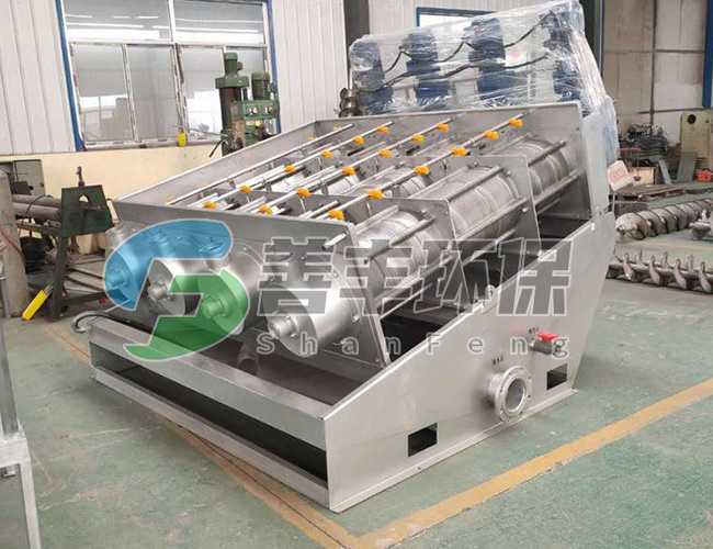 2、在主軸上,位于排泥箱內(nèi)設有阻泥板,阻泥板與脫水簡之間留有間隙。阻泥板的設置可阻擋污泥,使脫水簡內(nèi)的污泥具有一定的壓力, 可將污泥中的水充分擠出,達到更好的脫水效果。