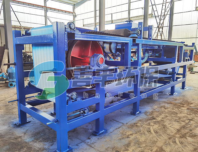 料漿由進(jìn)料裝置均布在向前移動(dòng)的濾布上,在真空泵的抽濾作用下,濾液穿過過濾布和膠帶過濾孔進(jìn)入真空箱,再從真空箱下部的連接管道進(jìn)入濾液罐,固相截留在濾布上形成濾餅。由于重力和真空抽力方向一致,沉降時(shí)較大顆粒沉在濾餅之下,小顆粒沉在濾餅之上,形成結(jié)構(gòu)合理的助濾層,其阻力小。過濾速度高。所形成的濾餅隨膠帶而移動(dòng)被多次洗滌,脫水,然后在濾布轉(zhuǎn)向處脫落。其后,濾布和膠帶經(jīng)過驅(qū)動(dòng)轘分開,分別用高壓水清洗再生,濾布經(jīng)過糾偏裝置調(diào)整后,重新回到進(jìn)料端開始新的作業(yè)循環(huán)。