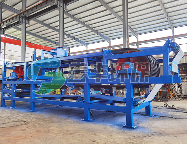 橡膠帶式真空過(guò)濾機(jī)是以濾布作為過(guò)濾介質(zhì),充分利用物料的重力,依靠真空負(fù)壓力為動(dòng)力實(shí)現(xiàn)固液分離的分離設(shè)備;設(shè)備在結(jié)構(gòu)上,過(guò)慮區(qū)段沿著水平長(zhǎng)度方向布置;采用了固定真空盒。設(shè)備在生產(chǎn)過(guò)程的過(guò)濾、濾餅洗滌、卸渣、濾布清洗隨膠帶的運(yùn)行連續(xù)完成;設(shè)備可適應(yīng)不同濃度的物料,并且母液和濾餅洗滌液可以分段收集,具有生產(chǎn)能力大、過(guò)濾效率高、洗滌效果好,濾餅含濕率低等優(yōu)點(diǎn)。同時(shí),膠帶速度、進(jìn)料量、料漿濃度、洗滌水量、真空度、洗滌區(qū)和干燥區(qū)均可根據(jù)生產(chǎn)需要選擇理想?yún)?shù)。設(shè)備易損件少,故障率低,可實(shí)現(xiàn)長(zhǎng)周期連續(xù)運(yùn)轉(zhuǎn)、運(yùn)行平穩(wěn)、操作簡(jiǎn)便、勞動(dòng)強(qiáng)度低。