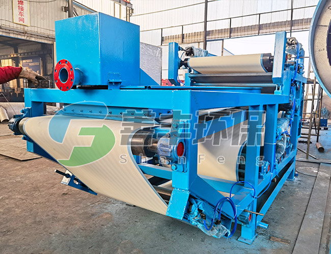 污泥經(jīng)投加凝聚劑后進(jìn)行充分混合反應(yīng)之后流入濃縮段的進(jìn)料分配器,將污泥均勻分布到傾斜式的濃縮段上,并在泥耙的雙向?qū)韬椭亓ψ饔孟?,污泥隨著濾帶的轉(zhuǎn)動(dòng),迅速脫去污泥的游離水。重力脫水后濃縮污泥經(jīng)反轉(zhuǎn)機(jī)構(gòu)將污泥輸送至帶式壓濾機(jī)的重力脫水段進(jìn)一步脫水。然后喂入“S”形壓榨段,在“S”形壓榨段中,污泥被夾在上,下兩層濾布中間,經(jīng)若干個(gè)不同口徑輥筒反復(fù)壓榨,使污泥再一次脫水,醉后通過(guò)刮將泥餅刮落,而上下網(wǎng)在運(yùn)行過(guò)程中不斷地被自動(dòng)清洗。