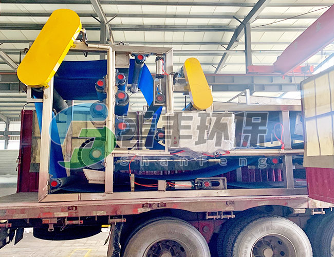 污泥經(jīng)投加凝聚劑后進(jìn)行充分混合反應(yīng)之后流入濃縮段的進(jìn)料分配器,將污泥均勻分布到傾斜式的濃縮段上,并在泥耙的雙向?qū)韬椭亓ψ饔孟?,污泥隨著濾帶的轉(zhuǎn)動(dòng),迅速脫去污泥的游離水。重力脫水后濃縮污泥經(jīng)反轉(zhuǎn)機(jī)構(gòu)將污泥輸送至帶式壓濾機(jī)的重力脫水段進(jìn)一步脫水。然后喂入“S”形壓榨段,在“S”形壓榨段中,污泥被夾在上,下兩層濾布中間,經(jīng)若干個(gè)不同口徑輥筒反復(fù)壓榨,使污泥再一次脫水,醉后通過(guò)刮將泥餅刮落,而上下網(wǎng)在運(yùn)行過(guò)程中不斷地被自動(dòng)清洗。