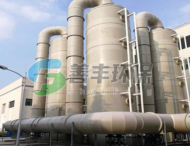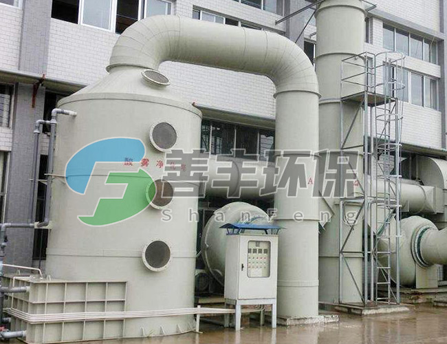 酸堿廢氣處理(噴淋塔)主要的運作方式是不斷酸霧廢氣由風(fēng)管引入凈化塔,經(jīng)過填料層,廢氣與氫氧化鈉吸收液進行氣液兩相充分接觸吸收中和反應(yīng),酸霧廢氣經(jīng)過凈化后,再經(jīng)除霧板脫水除霧后由風(fēng)機排入大氣。吸收液在塔底經(jīng)水泵增壓后在塔頂噴淋而下,之后回流至塔底循環(huán)使用。