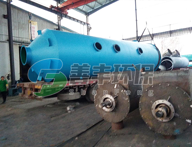 8、酸堿廢氣處理塔分單塔體和雙塔體。采用圓形塔體,用法蘭分段連接而成。具體由貯液箱、塔體、進風(fēng)段、噴淋層、填料層、旋流除霧層、出風(fēng)錐帽、觀檢孔等組成。