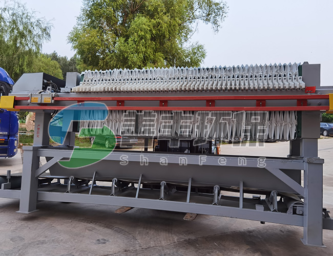 懸浮液用料泵送入濾機(jī)每個(gè)密閉的濾室,在壓力作用下,濾液透過濾層及濾布,經(jīng)濾布出液口排出,濾渣則留在濾框內(nèi),從而達(dá)到固液分離的目的。