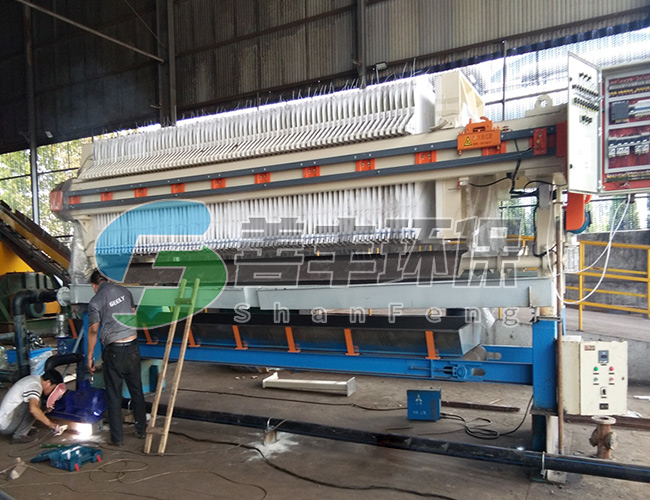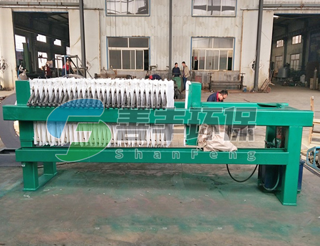 懸浮液用料泵送入濾機(jī)每個(gè)密閉的濾室,在壓力作用下,濾液透過濾層及濾布,經(jīng)濾布出液口排出,濾渣則留在濾框內(nèi),從而達(dá)到固液分離的目的。